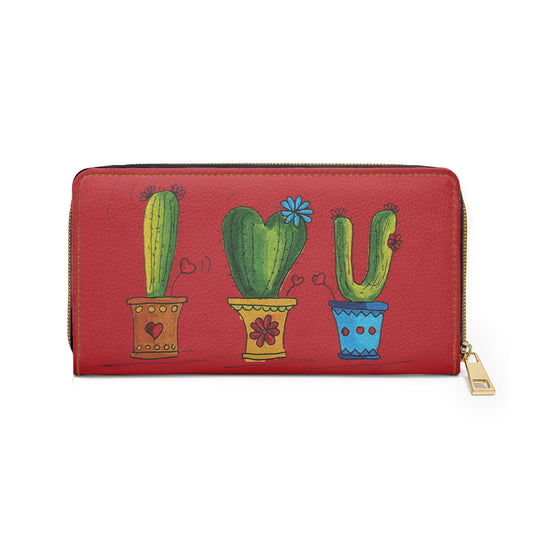 Cactus Doodle Zipper Wallet — Dark Red Potted Succulent Design