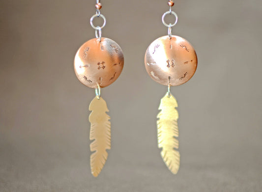 Bronze Feathers from Copper Disc Dangle Earrings