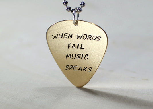 Bronze guitar pick necklace stamped with When words fail music speaks